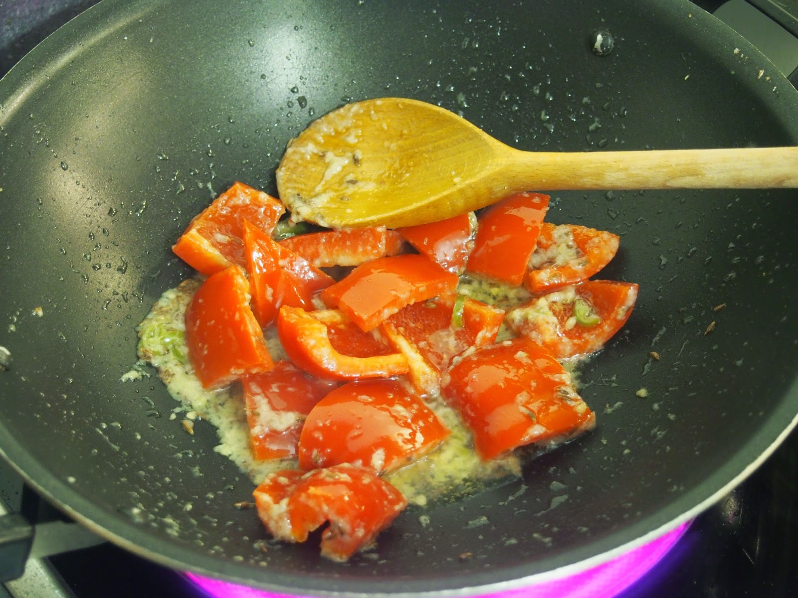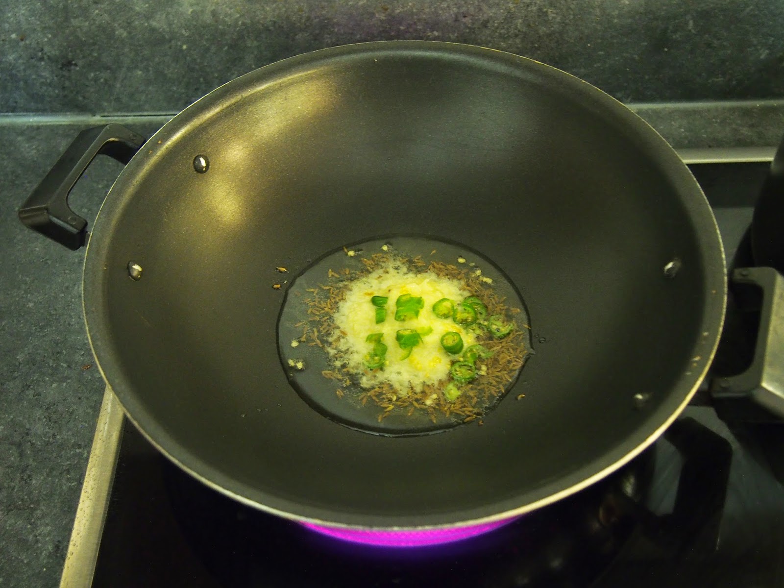 Step 4. Get a pan, add some oil, cumin seeds, garlic, ginger and chilli – let it heat up and cook a little