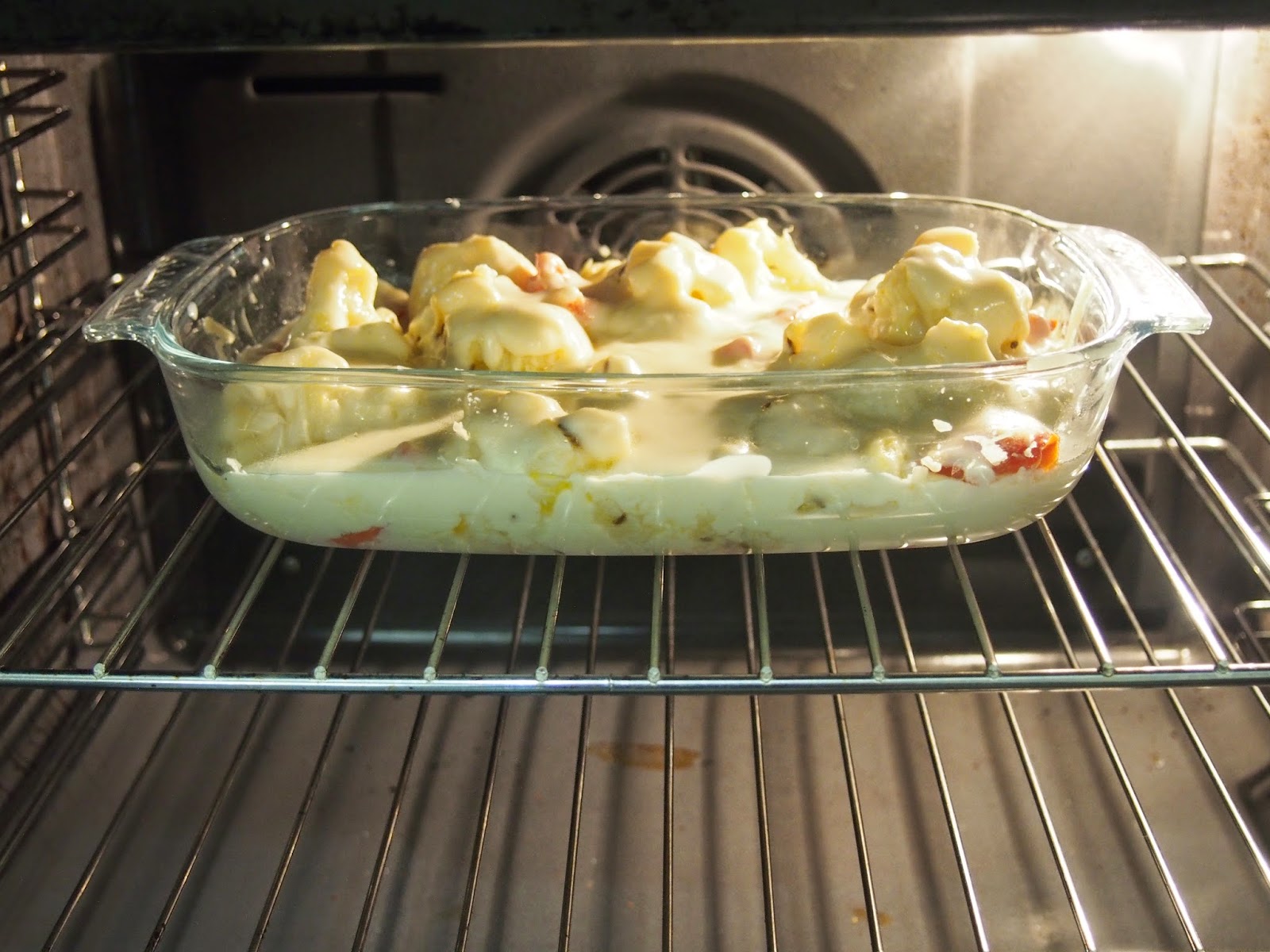Step 9. Pour the cheese sauce over it and pop it in the oven at around 180 degrees for 10 minutes.